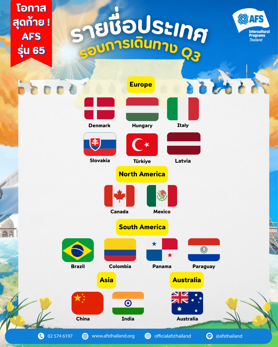 โครงการเยาวชนเอเอฟเอสเพื่อการศึกษาและแลกเปลี่ยนวัฒนธรรมนานาชาติ ระยะ 1 ปี รอบสุดท้าย รุ่นที่ 65 (เดินทาง Q3: ก.ค. 69 – ก.ค. 70)